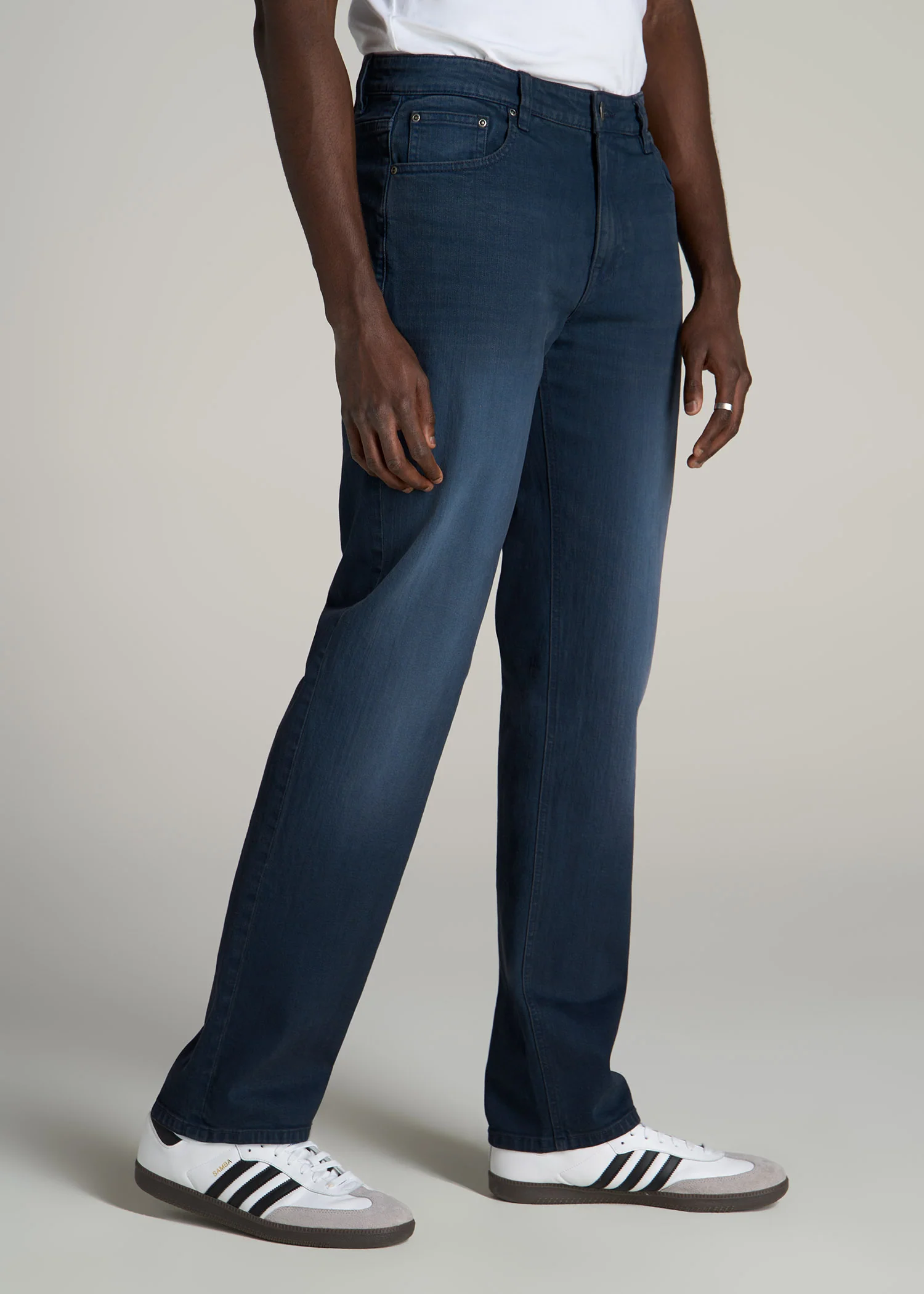 The OG denim fit in a length that fits your frame. Straight leg jeans for tall men are a must-have in every guy's closet and were one of the original denim styles in the mid-1900s (think James Dean and John Wayne). While jeans have been around for ages, finding options for tall guys has always been a struggle – until now. All of our men's tall jeans are designed specifically for guys between 6'3” and 7'1”. This pair has a bit more room in the hips and thighs with a higher mid-rise waist and a traditional five-pocket design. The straight-leg style will go all the way past your ankles with inseams ranging from 36” to 40” so you'll never have to worry about too-short lengths again. Good denim is key when it comes to quality jeans, which is why we sourced a premium cotton-spandex blend that provides the right amount of stretch and structure. Wear these jeans with a comfy quarter-zip sweatshirt and sneakers to walk the dog or with a belt and a button-down shirt for meetings at the office.