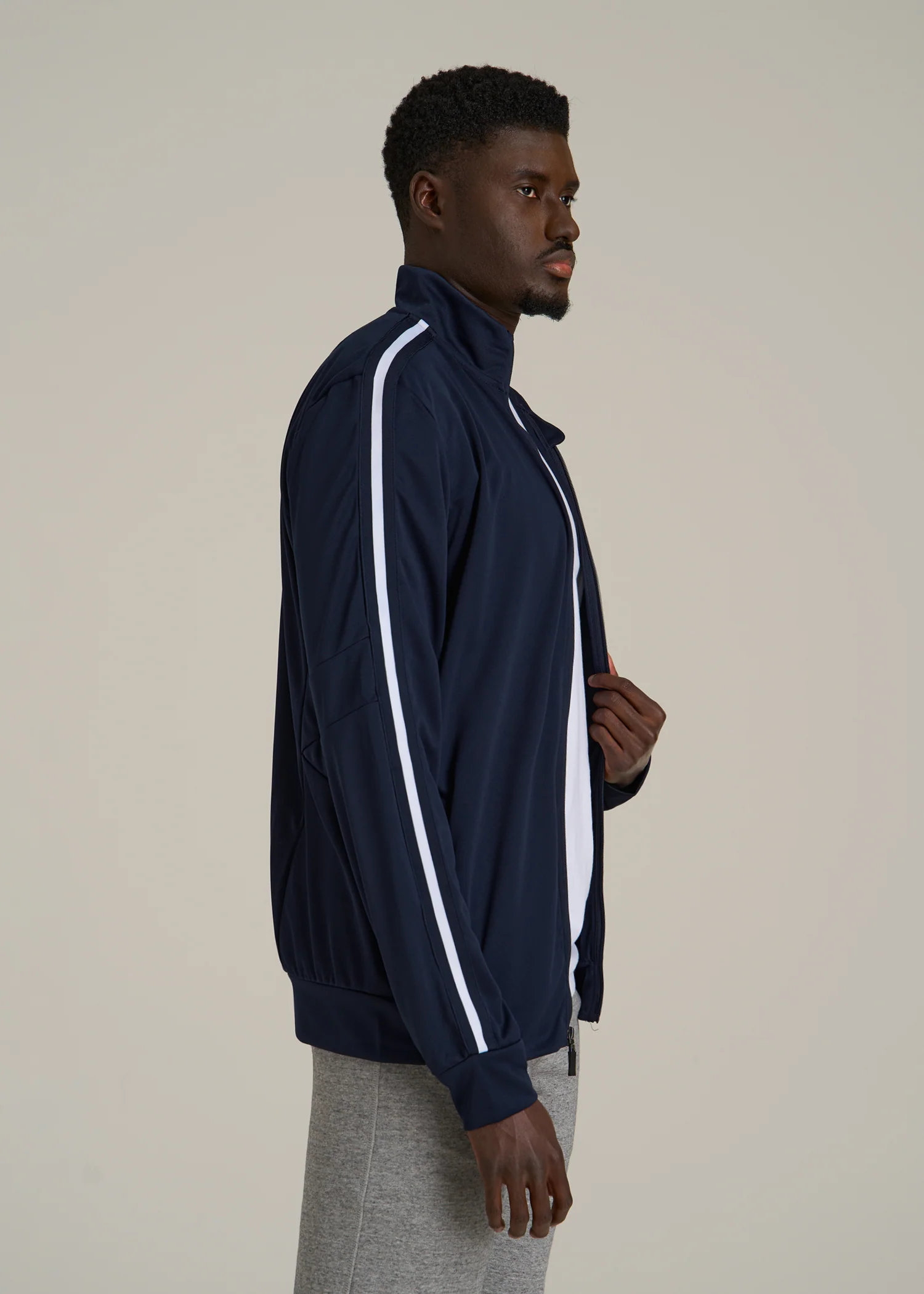 Take your athleisure game to the next level in this tall men's jacket. Lightweight, breathable and quick-drying, this athletic stripe jacket will look just as at home on the couch as it will on the field or the court. We know the struggle of finding quality athletic jackets for tall men, which is why we set out to design the ultimate athleisure essential for guys over 6'3”. It has proper proportions at every seam, from the extra-long sleeves with stripe detailing down the sides to the hip length you'll never have to worry about pulling down. The regular-fit will flatter your tall frame while still providing plenty of room for movement and the side pockets with hidden zippers are great for storing all of your essentials. We carefully sourced a quality fabric that's quick-drying and flexible so you can stay comfortable whether you're working out or hanging out. Wear it with our matching athletic stripe pants and a fitted tee to watch the game or warm-up on the sidelines.